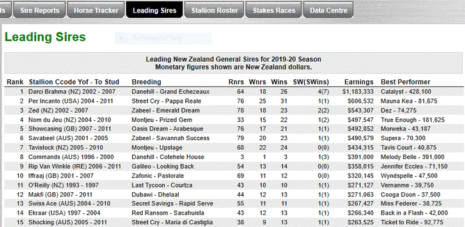 Darci Brahma is currently leading the NZ General Sires List for 2019/20